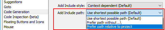 Alternative settings are available to prefer a path without relative reference to a parent directory, or to a path relative to the project. For both alternates, Visual Assist uses the shortest possible if the preference is not possible.