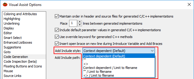Visual Assist inserts include directives whose path delimiter, '/' or '\', is identical to the delimiter of existing include directives in the file. If the current file does not contain any include directives, or none of the existing directives use a path delimiter, Visual Assist uses a delimiter based on the current IDE.