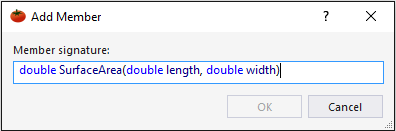 After you invoke Add Member, a dialog opens in which you type the signature of a new method or member variable.