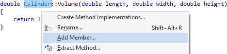 Code generation with Add Member is a convenient way to add a method or member variable to a class. The command is available from any reference to a class, so you add members without interrupting your normal flow of editing.