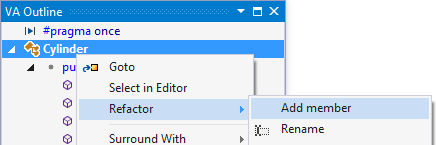 You can also invoke Add Member from the context menu of the VA Outline, when the current selection is a class. In C/C++, this implies typically that you invoke Add Member when viewing the outline of a header file, not a source file. (Opening the refactoring menu when the current selection is a member lets you Add Similar Member.)
