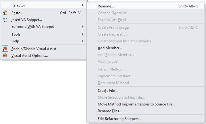 You may add to the menu the Visual Assist commands most meaningful to you. The following menus are included with Visual Assist in newer IDEs. The entries in these menus, especially the entries without default shortcuts, are reasonable candidates for a menu in Visual C++ 6.0.