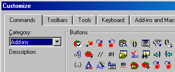 Add a menu item by selecting "Add-ins" from the Category pull down list. Available Visual Assist commands appear, which can be dragged and dropped either to a toolbar or into a menu. Drag a command to the newly created menu so it remains. (If you deviate from the process, the menu disappears and you become unable to add commands to it.)