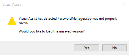 Visual Assist frequently saves files you modify to a cache on disk. If your IDE inadvertently crashes, Visual Assist gives you the opportunity to load the latest unsaved version from cache the next time you open your file.