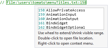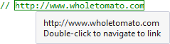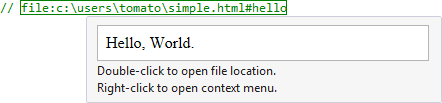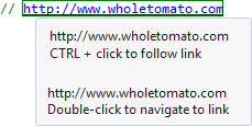 The Default plug-in tells Visual Assist to show a tooltip when hovering, and then launch a browser or shell command upon double-click. The hovering tooltip contains an expanded URL or shell command.