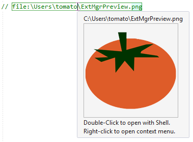 The File Viewer plug-in previews the content of files whose paths appear in source comments. Preview-able formats include HTML, XAML, RTF, text, video formats such as mpg, and image formats such as jpg, png, and svg.