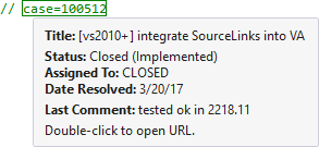 The FogBugz plug-in is applicable to links that target FogBugz case management. Hovering tooltips contain information about respective cases.