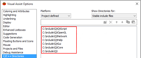 If the Qt directories do not appear in the options dialog for Visual Assist, yet Qt is listed in your VC++ Directories, it is likely you have the same Qt directories in Additional Include Directories of your project. (This can happen when you install the Qt Add-in.) If this is the case, remove the Qt directories from Additional Include Directories.