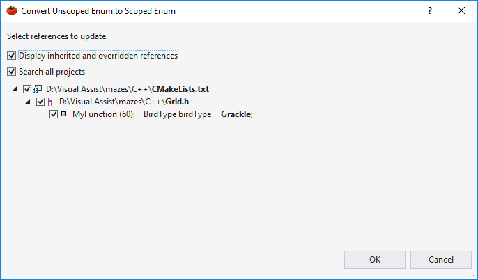 The Convert Unscoped Enum to Scoped Enum command displays a dialog where you can select the references you want to update. The dialog displays the results of searching for instances of the enumerator values defined in the selected enum.