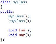 The following example is of a class declaration in C++ whose methods can be implemented.