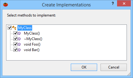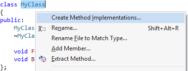Create Method Implementations provides C/C++ users with an efficient mechanism for creating implementation stubs for all of the methods in a class declaration. (Create Method Implementations is similar to Create Implementation, which can be invoked from the declaration of a single method.)