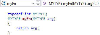 For C/C++ users, definitions reflect moderate evaluation of typedefs and preprocessor macros during parsing of definitions. In this way, Visual Assist displays definitions in meaningful terms; definitions are not evaluated to base types alone. For example, the Definition field indicates myFn() returns a MYTYPE, not an int, despite the fact MYTYPE is a typedef for a int.