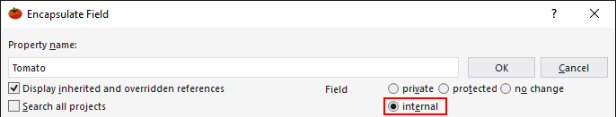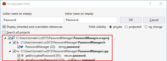 All references to the field in the current project are listed. These references will be updated automatically to use the new accessors. If you want to extend the field search to all projects or prevent updating of any references, adjust checkboxes accordingly. If you wish to prevent updating of any references, uncheck the top-level box, i.e. the one associated with the current project.