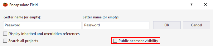 A dialog opens in the event you want to change default encapsulation. Accessors are named automatically per a set of rules described below. Adjust the names in the dialog if necessary. In C++, omit a getter or setter name to avoid creating the corresponding accessor.
