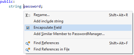 Use Find References to locate all places in your code that require updating before renaming an encapsulated field.