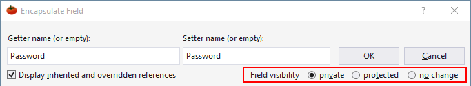 Refactor with Encapsulate Field to restrict or filter access to a member field. Encapsulation generates methods to read and write the value of a field, in lieu of providing access to a field directly. The accessor methods are typically called "get" and "set" methods, and have public visibility. The field the accessors encapsulate is often made private.