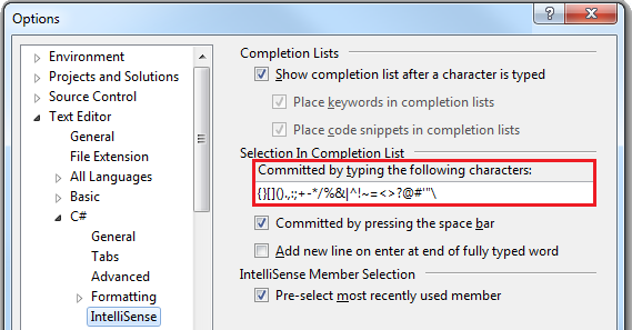 Specify additional characters that accept entries in the options dialog for Visual Studio. Select the dedicated option if you want entries "committed by pressing the space bar".