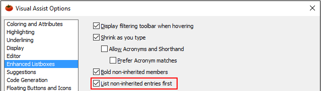 In all versions of Visual Studio, listboxes in Visual Assist provide more functionality for navigation and selection than the built-in listboxes. And, the advanced functionality is available irrespective of the origin of listbox content. When Visual Assist is responsible for listbox content, the content is often available faster, for more symbols, and with more accurate results than content from Visual Studio.