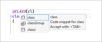 Enable suggestion of VA Snippets within UE macros by changing the value of AllowSnippetsInUnrealMarkup: