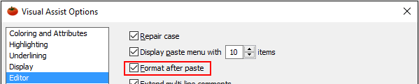 Visual Assist does not offer indenting and formatting options beyond those of the IDE. When a feature of Visual Assist offers to format code, e.g. Format after Paste, Visual Assist lets the IDE format according to settings in the IDE options dialog.