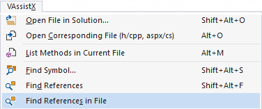 Find References in Visual Assist find usages of the current symbol within the current project or solution. The command ignores similarly named symbols of different contexts, and provides much more efficient access than Find in Files.