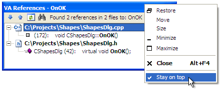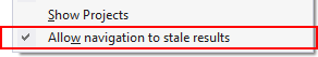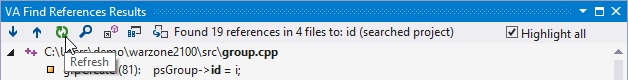 If you navigate to a stale reference, Visual Assist will open and jump to the top of the file containing the reference. (The jump is your indication that the reference no longer exists.) A refresh in a results window will update all references to avoid the jumps, but each refresh may require considerable time to execute. If you prefer not to refresh results as you make significant edits, allow navigation to stale results in the context menu of the Find References Results window; Visual Assist will navigate to original locations even when original references are no longer present.