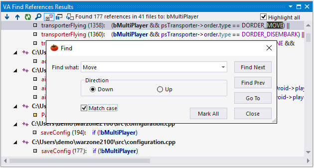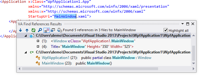 For frameworks that employ a code-behind model, such as WPF, Visual Assist finds references in both design and code-behind files.