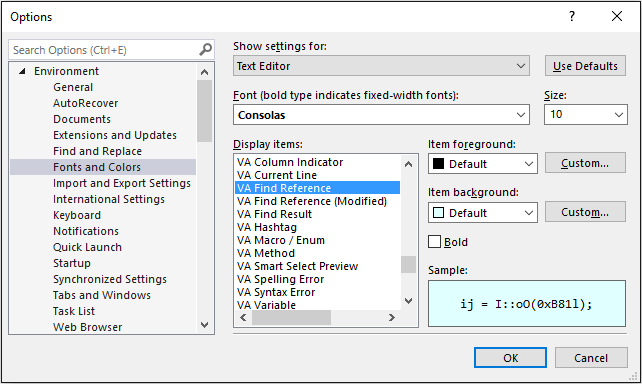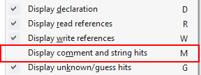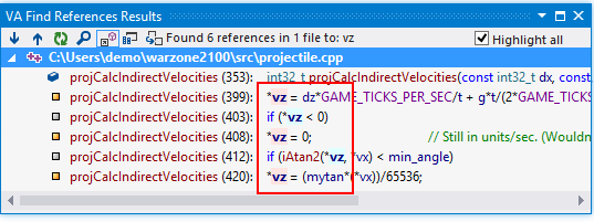 References found can appear bold and highlighted in the results window. By default, references where a symbol is written are typically highlighted in MistyRose, whereas references where a symbol is read are highlighted in LightCyan.