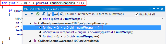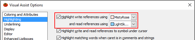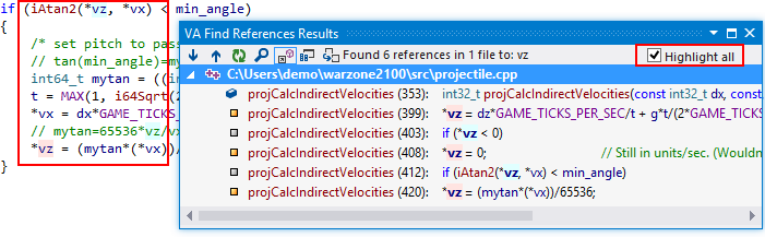 Make highlighting of references in source windows the default enabling the option in the context menu of a Find References Results window, or by checking the option associated with highlight colors in the options dialog for Visual Assist.