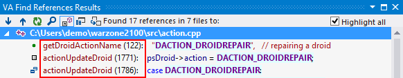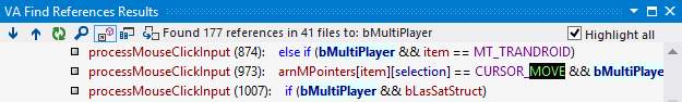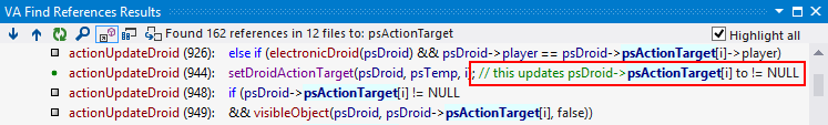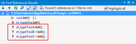 In some instances, e.g. with symbols defined using complex preprocessor macros, Visual Assist may be unsure if particular references to a symbol are legitimate. In these cases, the references are earmarked with a question mark in the results window.