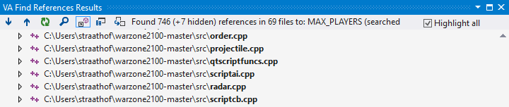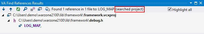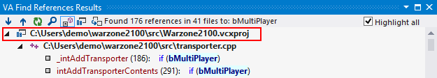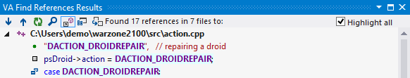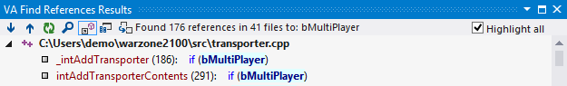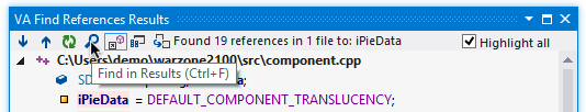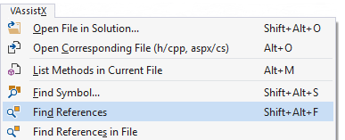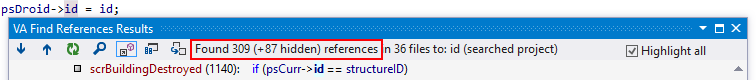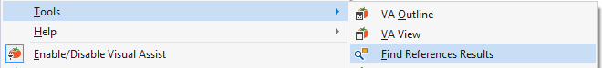 Important: Similar to the behavior of Find in Files, closing of a Find References Results window does not terminate a running search. A search will continue in the background if its window is closed. You can view the results of a search that ran in the background by reopening the Find References Results window, using VAssistX | Tools | Find References Results (Alt+X, T, F).