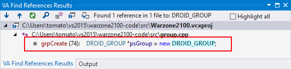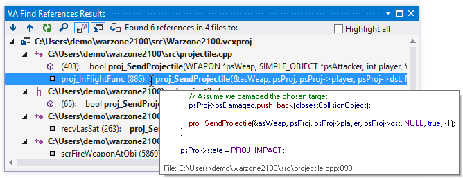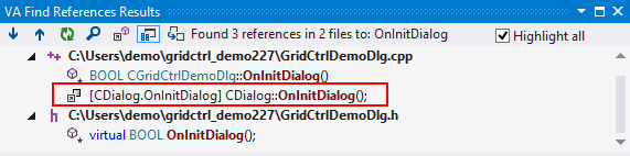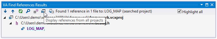Output from Find References is placed in the Find References Results window, where results are grouped by project and file.