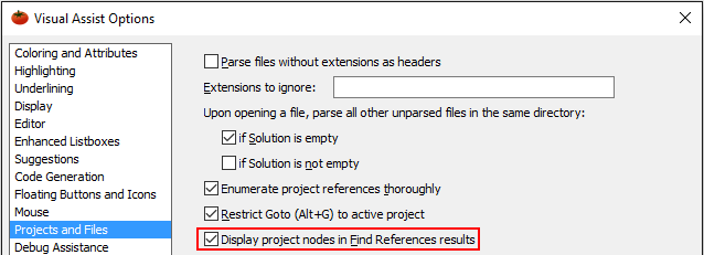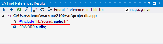A header file in C/C++ whose name is that of a symbol might be considered a reference to the symbol. For example, Foo.h that contains the declaration of class Foo might be considered a reference to Foo. Visual Assist can include such header files in results windows.