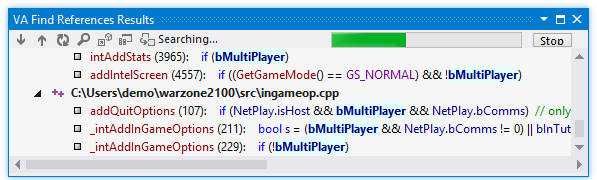 • Alt+F3,S - The shortcut stops the continuous movement of results in the VA Find References Results window, but the search continues, and it is visible on the search progress bar.