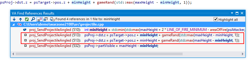 Multiple references that occur on a single line in source appear in multiple entries in a results window.
