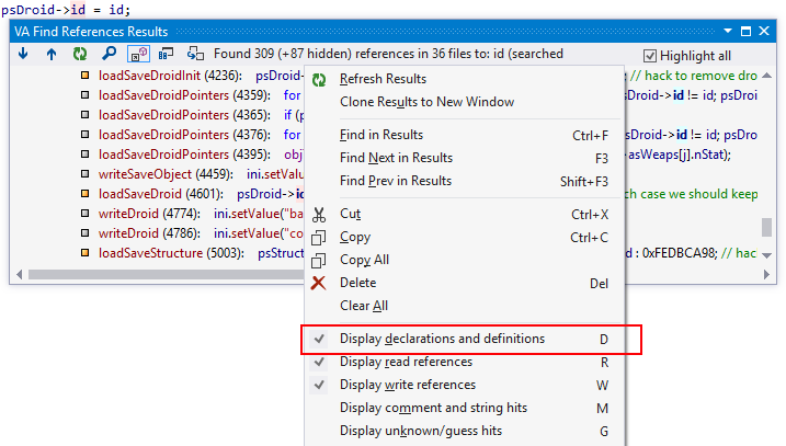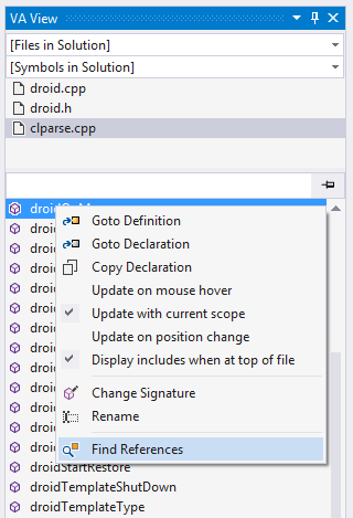 Find References is available from a declaration, definition, or reference to a symbol. Because Find References is typically used often, you may invoke the command in numerous ways: