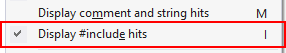 The option to display #include hits is available in the context menu only if a results set includes them.
