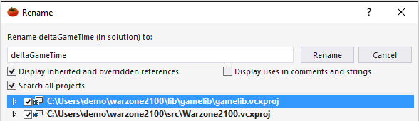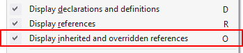 Visual Assist can display, in results windows, inherited references from parent classes and overridden references in child classes.