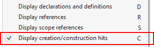 If your symbol identifies a class or struct that can be instantiated, search results include references to creations and constructions of the class or struct. You can narrow search results to contain only the instantiations by toggling off all filters but that for creation/construction hits.