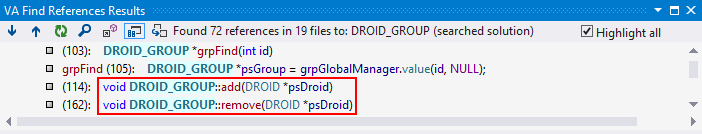 You can broaden searches to include references that only identify scope, e.g., references to class DROID_GROUP required only to identify methods within the class.