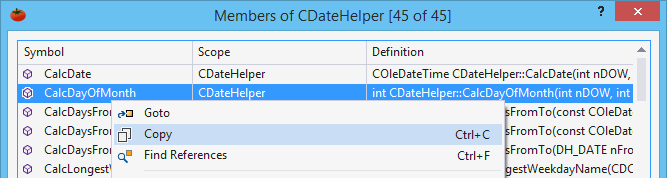 Use GoTo Member to browse members of a class, or "members" of other data structures. GoTo Member opens a dialog that supports filtering, copying of symbol names, and jumping to definitions.