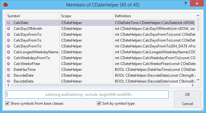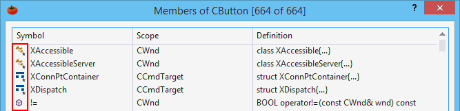 Types of symbols within the dialog are identified by icons adjacent to symbol names. For a class, types might include member, struct, and nested class.