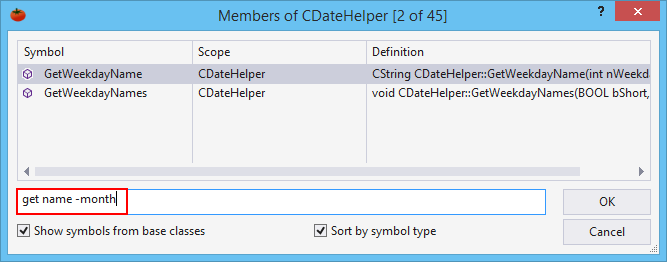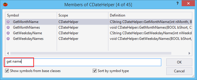 Visual Studio 2017 includes Go to Member, which is similar in name only to GoTo Member of Visual Assist. The version built into the IDE lets one search among all symbols considered members in an entire solution. The Visual Assist implementation, on the other hand, provides quick access and browse capability to members of the current symbol in the editor. The Visual Assist implementation is context aware; the IDE version is not. Go to Member in Visual Studio 2017 is similar to Find Symbol in Solution in Visual Assist.