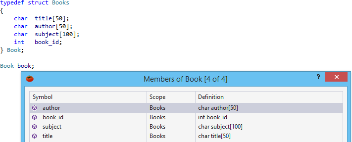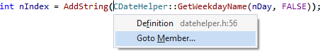 GoTo Member is available from types, variable names, and white space. When invoked on a type or variable name, GoTo Member opens a dialog with all members of the respective data structure. When invoked in white space within a data structure, e.g., class or enum, GoTo Member opens a dialog with all members of the enclosing structure.