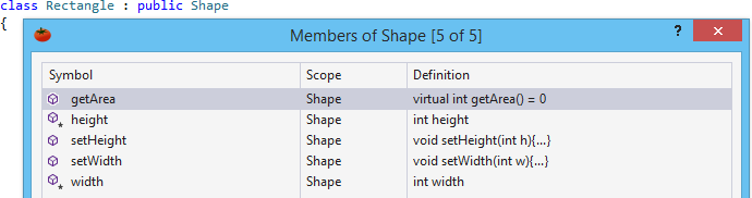 The GoTo Member dialog for a class, or from white space within a class, includes all members of the class, and optionally, members of bases classes. Double-click, or select a symbol and press Return, to jump to the definition of the symbol.