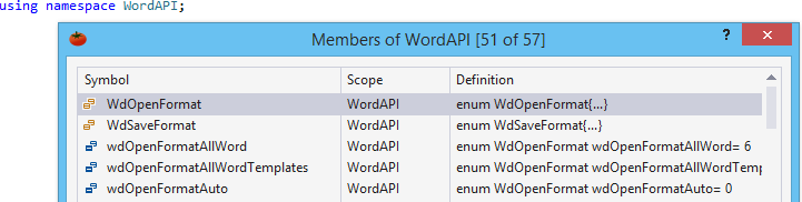 For a namespace, GoTo Member displays all symbols available in the namespace.