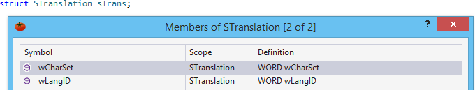 The GoTo Member dialog for a struct includes all symbols declared in the struct.
