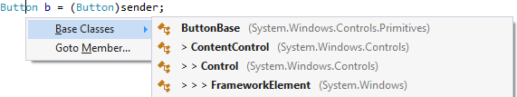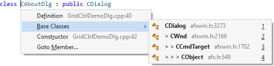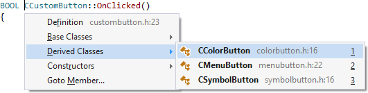 When applicable, inheritance for a symbol is depicted in sub-menus, letting you understand hierarchy and jump into it.