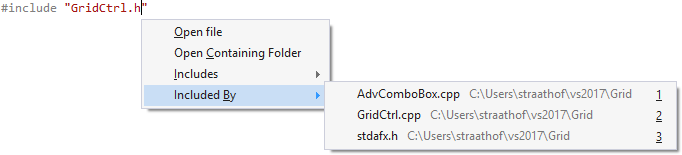 GoTo Related on an include directive opens a menu of related commands and jump locations, e.g. other headers that include the file.
