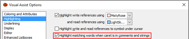 Automatically highlight words matching the active word when the caret is in a string or comment. Highlighting extends beyond the string or comment to "symbols", or words, that are identical in name to the current word.